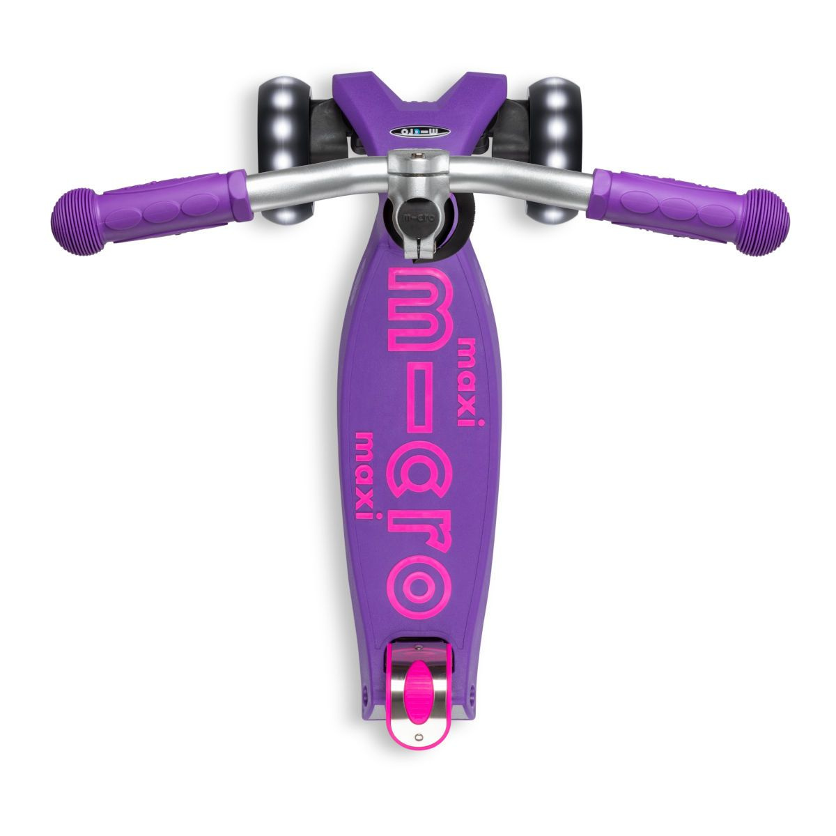 Dětská koloběžka Maxi Micro Deluxe Pro LED purple je bezpečná, stabilní a zábavná koloběžka ve fialové barvě s širokými LED předními kolečky. Je určená pro děti v přibližném věku 5-12 let. Koloběžka Maxi Micro byla původně určena jako následný produkt pro děti, které vyrostly z Mini Micro. Postupem času se z ní stal samostatný trendový produkt pro juniory a teenagery. Nášlapná deska řady Maxi Deluxe Pro má zvýšenou tuhost a stabilitu, ke které přispívá široké zadní kolečko. Díky této tuhosti zvládne koloběžka krátkodobou zátěž i 70 kg, i když předepsaná nosnost je 50 kg. Na horní části nášlapné desky je designový silikonový nápis, který zabraňuje sklouznutí nohy z desky. V zadní části koloběžky je nad zadními kolečky nášlapná brzda a reflexní prvky. Všechny hrany desky jsou zaoblené pro zvýšení bezpečnosti při manipulaci. Řídící tyč je eloxovaná ladící k barvě a designu koloběžky. Je výškově nastavitelná v rozsahu od 72-91 cm nad zemí. Řídítkovou tyč je možné kdykoliv jednoduše a rychle vyjmout z nášlapné desky, čímž ušetříte místo pro uskladnění nebo převoz. Koloběžka je pro pohodlnou jízdu vybavena širokými tvarovanými řídítky. Rukojeti řídítek jsou z kvalitních materiálů a na okrajích mají ochranný prvek, který zabraňuje uklouznutí ruky do strany, chrání prsty při těsném průjezdu kolem pevných překážek, ale ochrání třeba i lak auta, když to jezdec neodhadne. O zatáčení se stará jedinečný mechanismus, který zatáčí nakloněním řídící tyče a přenesením váhy. Jezdec má při jízdě na asfaltu podobné pocity jako při surfování, jízdě na snowboardu či skateboardu. Pohyb dětské koloběžky Maxi Micro Deluxe Pro zajišťují celkem 3 široká kolečka s kvalitními ložisky. Přední dvě kolečka jsou osazena LED světly, která nepotřebují baterii a která začnou svítit ve chvíli, kdy se koloběžka rozjede. Tato přední kolečka mají velikost 120 mm. Zadní 80 mm kolečko je umístěno na středové ose tak, aby nepřekáželo odrazové noze ani při mohutném odrazu. Maxi Micro Deluxe Pro je velice zábavná koloběžka s výrazným zážitkem při jízdě na kratší a střední vzdálenosti. Pokud potřebujete překonávat delší vzdálenosti, doporučujeme pro starší děti koloběžky typu Speed+ nebo Flex a pro mladší děti základní řadu Sprite nebo Cruiser.