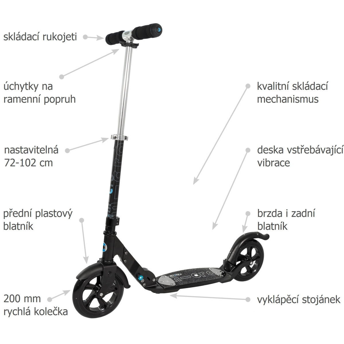 Koloběžka Micro Flex Black Matte převzala všechny výhody koloběžky Micro Flex a k tomu přibyla pevná kolečka 200mm.
