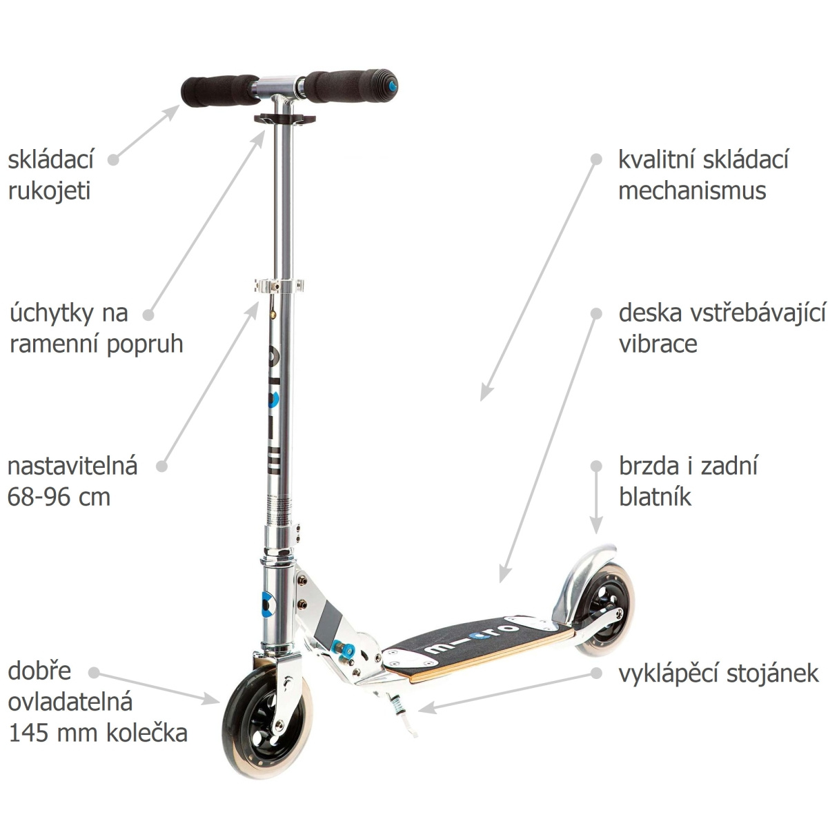 Koloběžka Micro Flex je velmi pohodlná skládací koloběžka. Tuto vlastnost jí zaručují především kolečka velká 145 mm a jedinečná dřevo-vláknitá deska se skelnými vlákny (fibreglass), který odolá tomu nejnáročnějšímu zatížení a dá koloběžce výjimečné vlastnosti. Na koloběžku je možné použít ramenní popruh.Více