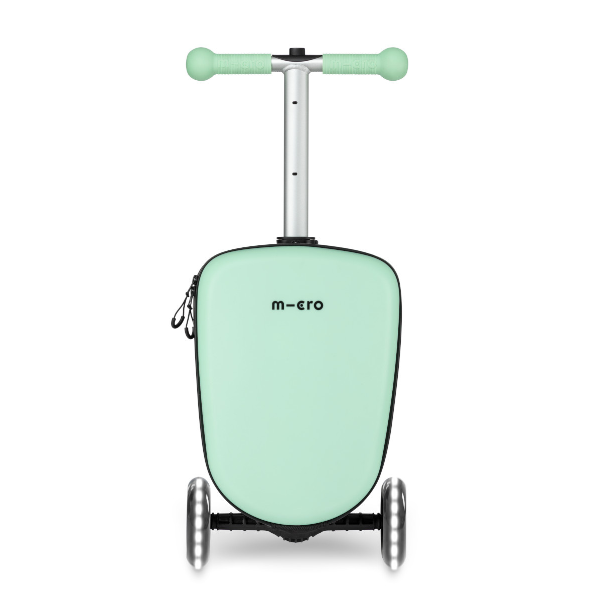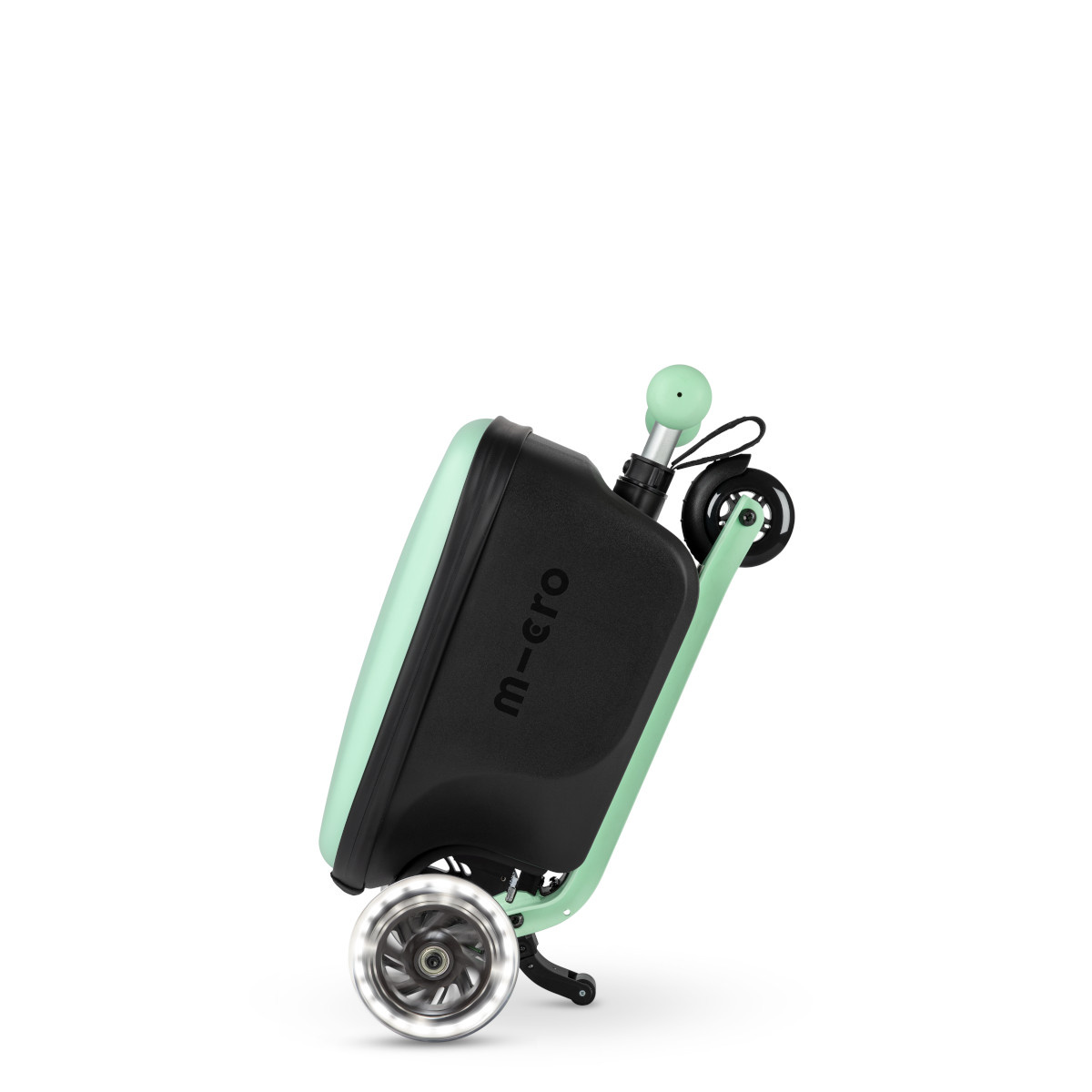 Micro Luggage Junior je vybaven 3 kolečky z důvodu dobré stability a ergonomie při odrazu. Přední dvě kolečka jsou osazena LED světly, která nepotřebují baterii a která začnou svítit ve chvíli, kdy se koloběžka rozjede. Přední kolečka jsou větší (120 mm) a to z důvodu lepšího překonávání nerovností. Zadní kolečko je menší (80 mm) a je umístěno uprostřed tak, aby nepřekáželo noze i při velkém odrazu.