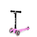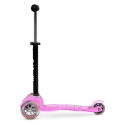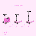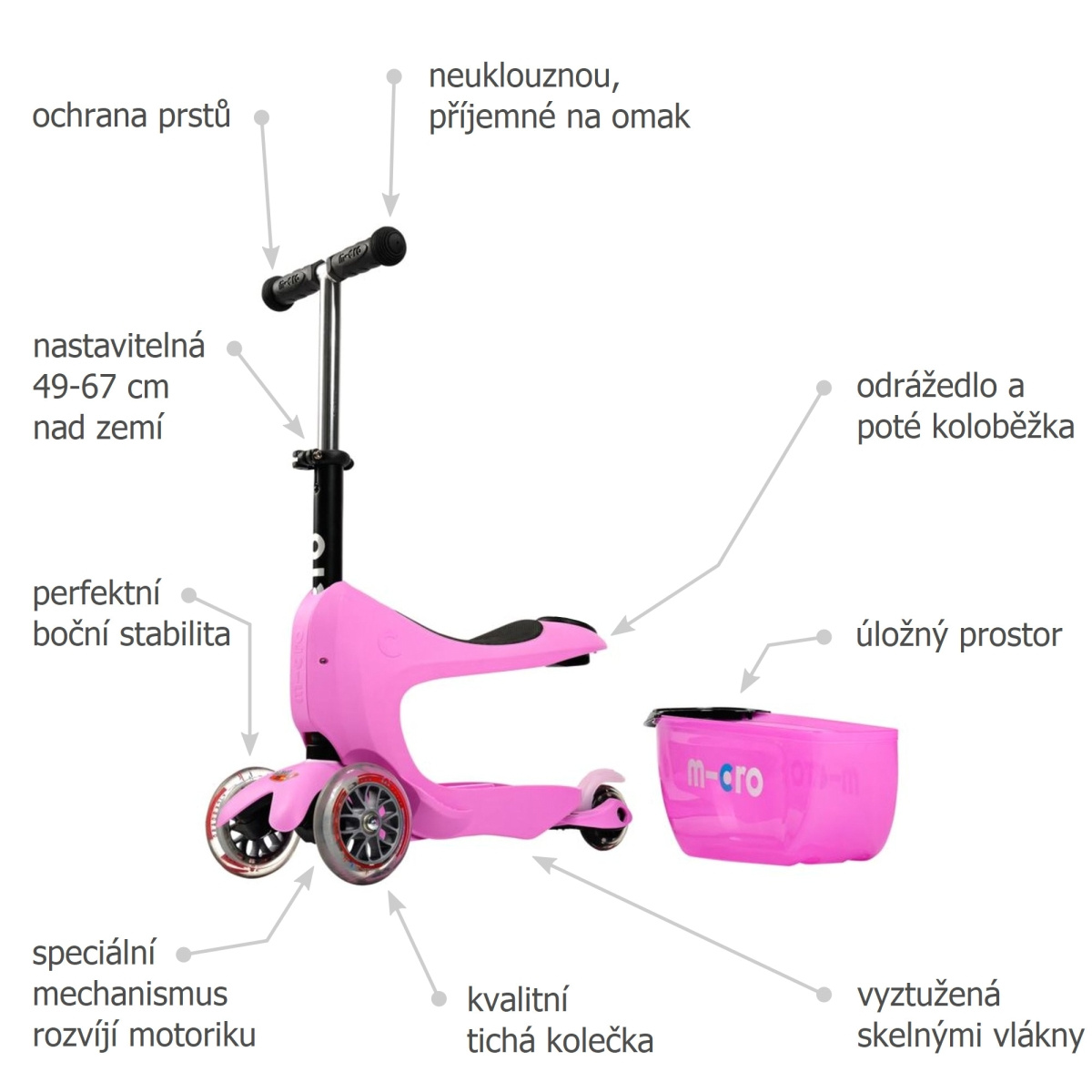 Mini2go Deluxe v růžové barvě je inovativní dětské odrážedlo s úložným prostorem a koloběžka v jednom. Tuto trojkolku využijí děti od 1,5 roku jako klasické odrážedlo a v pozdějším věku jako trojkolku nebo lépe řečeno koloběžku. Součást Mini2go Deluxe Součástí trojkolky je "kapotovaný sedák", který lze jednoduše odmontovat. Pod tímto sedákem je úložný prostor pro veškeré dětské nezbytnosti. Nosnost tohoto sedáku je max. 20 kg. Všestranné použití Až nebude sedlo potřeba, lze jej odmontovat, čímž vznikne Mini Micro Deluxe s výškově nastavitelnými řídítky 49-68 cm od země. Maximální věková hranice pro použití Mini2go Deluxe není přesně určena, limituje jí pouze maximální váha jezdce - do 35 kg. A v čem je ta největší výhoda? Díky způsobu zatáčení náklonem, rozvijí děti motoriku a rovnováhu. Cca ve třech letech začnou děti používat koloběžku bez sedla. Při jízdě, kdy uživatel stojí, se dále rozvijí motorika a částečně jízda simuluje styl karvingového lyžování. Ve spoustě zemích, převážně západních byla tato kombinace odrážedla a koloběžky oceněna jako "Nejlepší hračka pro batole" a získala různá světová ocenění.Více
