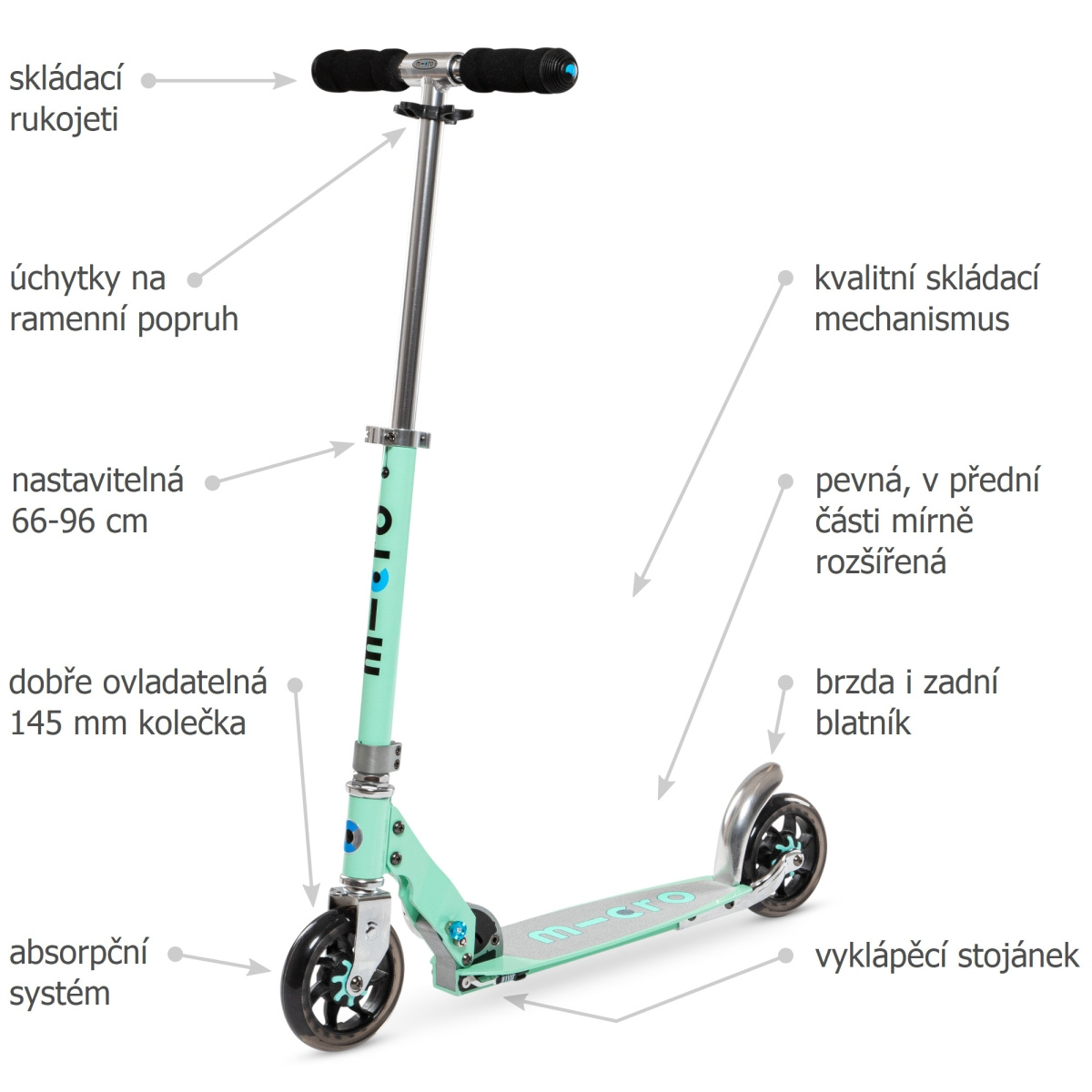 Díky své mátové barvě je koloběžka Micro Speed+ Mint oblíbená především u žen.