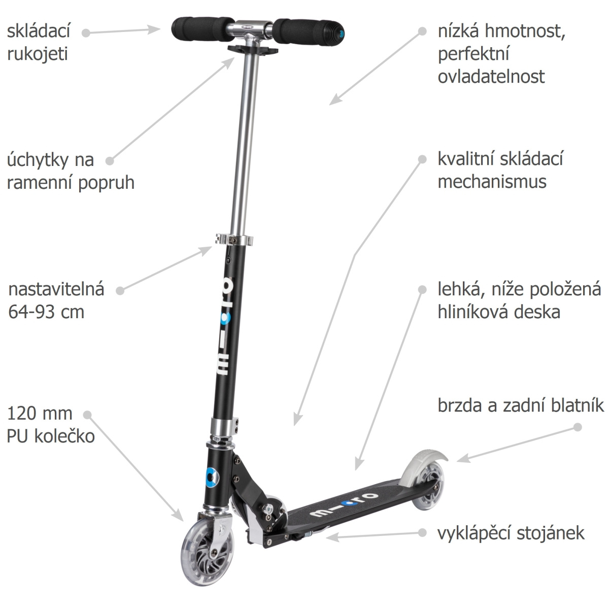 Model Sprite je díky své konstrukci a nízké váze velice dobře ovladatelný, bezpečný a intuitivní. Koloběžka je díky svým malým rozměrům velmi dobře skladná, na koloběžce jsou očka, takže si můžete ke koloběžce pořídit i popruh a koloběžku pak nosit např. přes rameno. Skládání samotné koloběžky je velmi snadné, stačí povolit rychloupínák, naproti tomu zmáčknout tlačítko a je hotovo. Koloběžky Micro mají samozřejmě stojánek, což určitě oceníte.