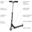 Vpředu koloběžky je kolečko 100 mm a vzadu je 120 mm kolečko, je to kvůli tomu, aby samotná koloběžka byla níže položená a dítě stálo a pohybovalo se na koloběžce vzpřímeně a nehrbilo se. Design koloběžky je taky super.