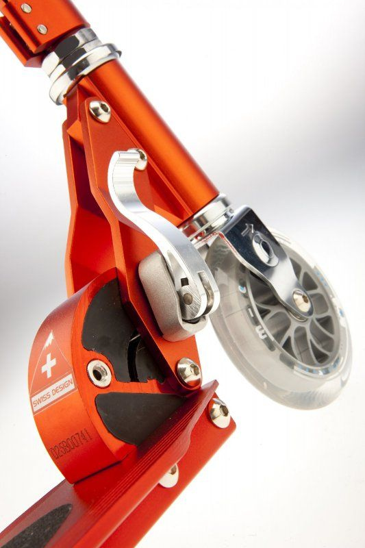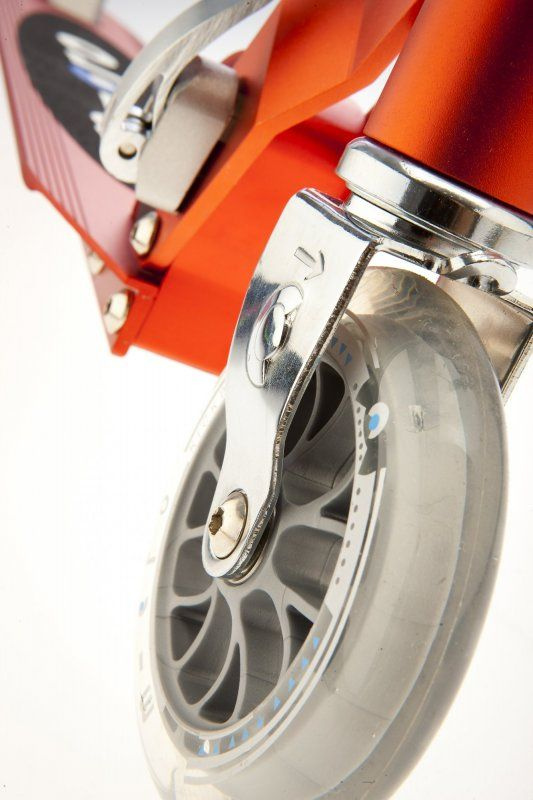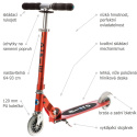 Vidlice je ocelová, závitová jsou zde kontramatky (musí se utahovat k sobě, aby se Vám neviklaly řídítka), je zde i dvojitá objímka. Brzda je na koloběžce pružinková, má uvnitř drážky, které dopomáhají k tomu, aby se lépe brzdilo.