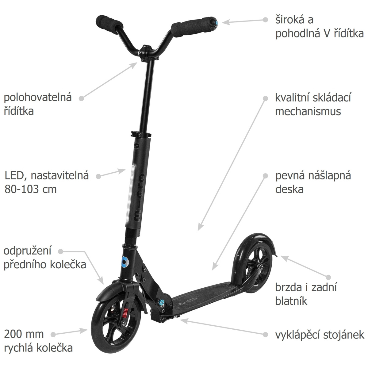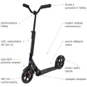 Micro Urban Black je skládací koloběžka s pevnou nášlapnou deskou, širokými tvarovanými řídítky, odpruženým předním kolečkem a integrovaným LED světlem v řídící tyči. Jedná se o rychlou a na ovládání komfortní koloběžku vhodnou i pro jízdu na delší vzdálenosti. Nášlapná deska a skládací mechanismus vychází z léty prověřené konstrukce modelu Micro Black. Je tedy pevná a při odrazech nehoupe (nepruží) jako modely Flex. Díky tomu nabízí výbornou dynamiku a komfort odrazu při jízdě. Pro nohy nabízí standardní čistou délku 33 cm. Řídítková tyč má integrované LED světlo na 2 baterie typu AAA (nejsou součástí balení). Výška řídítek je nastavitelná v rozmezí od 79 cm do 103 cm nad zemí. Rukojeti řídítek jsou u koloběžky Urban tvarované a nedají se složit, což zlepšuje tuhost celé koloběžky. Celková šířka řídítek je příjemných 53 cm. Tato šířka většině jezdců zlepšuje ovládání a komfort jízdy. Řídítka jsou polohovatelná a dají se nastavit podle přání každého jezdce. Koloběžka je vybavena předním plastovým blatníkem. Zadní nášlapná brzda, která má funkci zadního blatníku, je prodloužena a osazena reflexním prvkem. 200 mm PU kolečka v kombinaci s kvalitními ložisky zajistí svižnou a dynamickou jízdu s minimálním valivým odporem. Přední vidlice a její kolečko je pro zvýšení komfortu během jízdy odpruženo. Koloběžka obsahuje stabilní, dobře ovladatelný stojánek. Na koloběžku nelze použít popruh pro přenášení. Koloběžka se přenáší jednoduše za řídítkovou tyč ve složeném stavu. Jako všechny modely Micro, tak i Micro Urban Black lze jednoduše složit a uložit ho v práci pod stůl, do kufru auta nebo pod sedadlo veřejné dopravy.Více