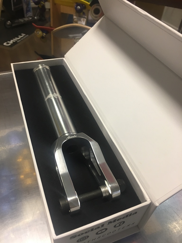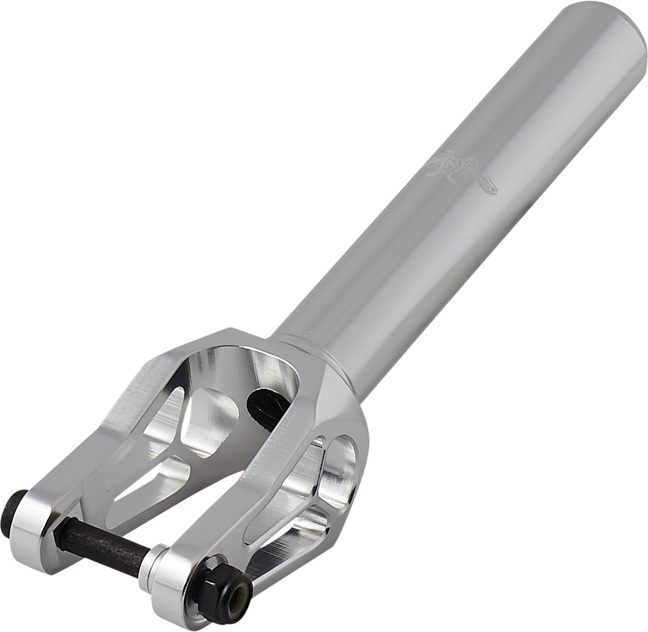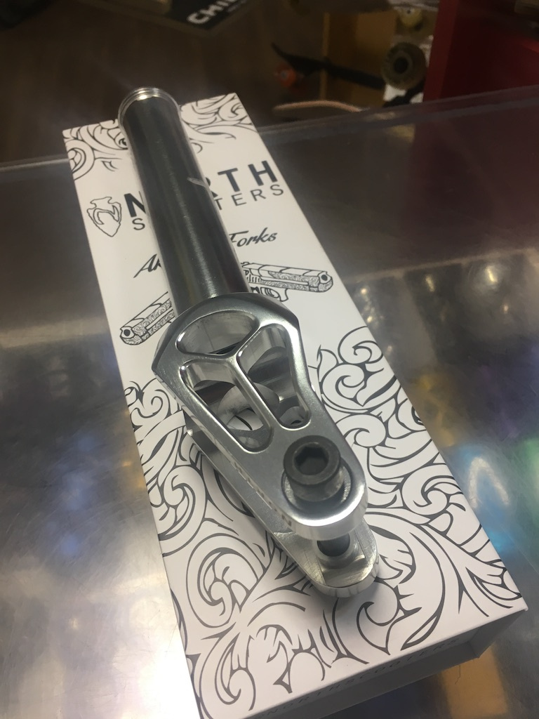 Velice kvalitní vidlice od kanadského výrobce North Scooters. Bytelná, lehká, jendodílná jak pro kolečeka se šířkou 24mm (klasické kolečka), 30mm (Radix kolečka). Také velikost koleček 120mm. Vidlice má integrovaný spodní kroužek pro headset. Také podložku pro SCS nebo HIC.