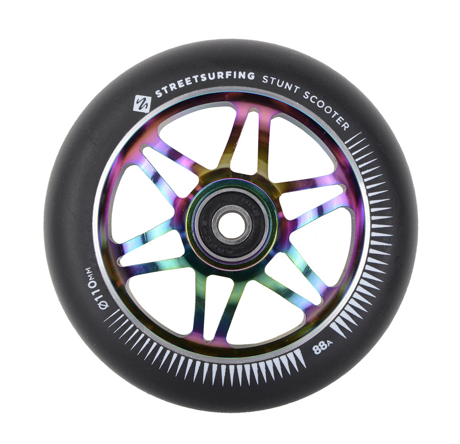 Street Surfing 110 mm kolečka s hliníkovým středem dorazili i k nám. Kolečko má hmotnost krásných 200 gramů. Tvrdost gumy je 88A. Kolečko je osazeno párem ABEC9 ložisek. V balení naleznete 1 kolečko.