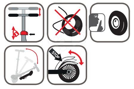 Koloběžky, freestyle kola a náhradní díly pro freestyle koloběžky jsou určené pro venkovní užití - skateparky s dřevěnými, železnými či betonovými překážkami. Freestyle koloběžky, kola a náhradní díly na koloběžky nejsou určené k užití v dešti a sněhu vzhledem k možné následné korozi dílů. Dále není vhodné používat koloběžku v prašném prostředí a na kamenitých cestách, stejně tak jako ke skokům na obrubníky apod. Zboží je určené pro extrémní sport, jehož součástí jsou skoky a pády. Nabízíme i textilní zboží, níže vám uvádíme některé z piktogramů, které se mohou na našem zboží objevit a přikládáme i vysvětlení. Zákazník uzavřením kupní smlouvy bere tyto informace na vědomí.