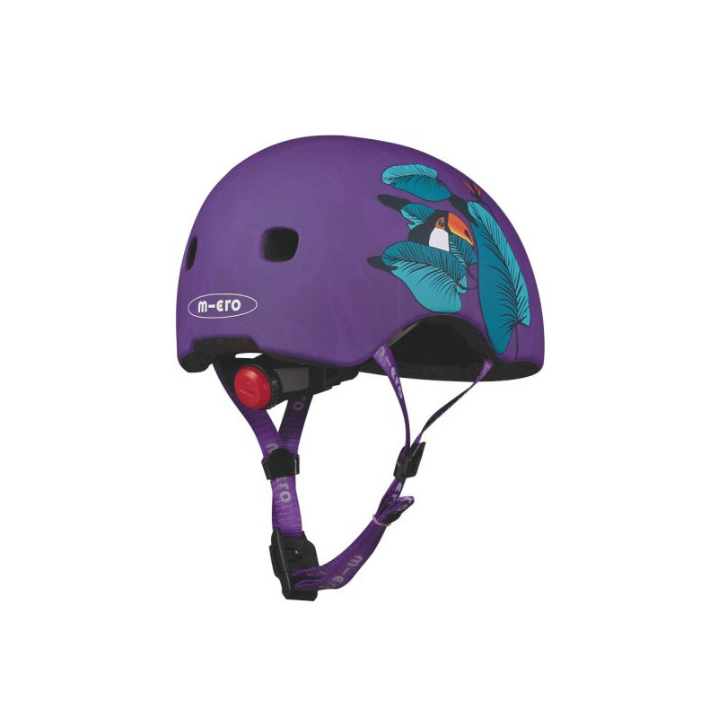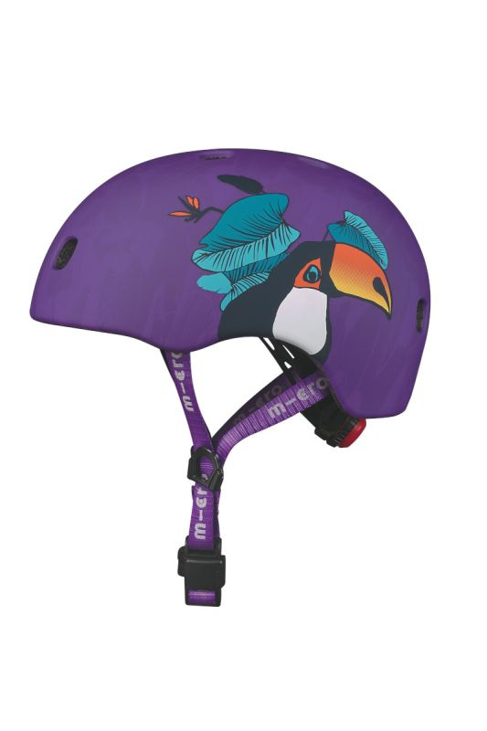 Bezpečná přilba značky Micro s nastavitelnou velikostí pomocí upínacího kolečka. Jedná se o fialovou přilbu s barevným motivem tukana. Přilba je vhodná pro jízdu na koloběžce, dětském odrážedle, kolečkových bruslích a skateboardu. Extra polstrování uvnitř přilby pro větší komfort a bezpečí. 8 větracích otvorů zajistí kvalitní odvětrávání hlavy. Inovativní magnetický systém zapínání výrazně zvyšuje bezpečnost a zjednodušuje zapínání řemínku pod bradou.