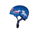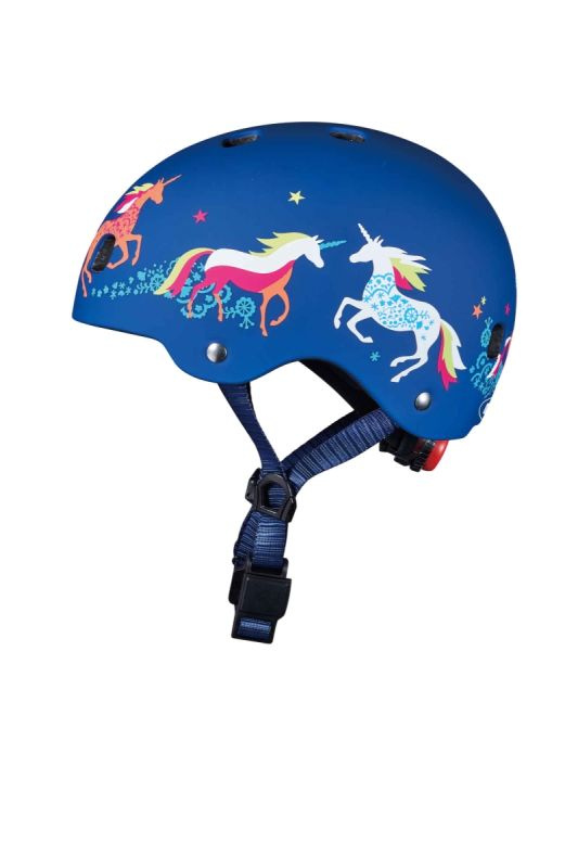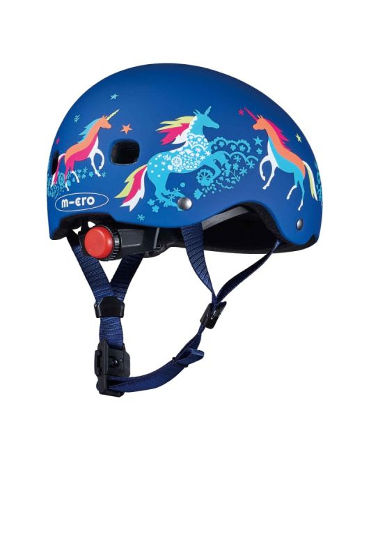 Bezpečná přilba značky Micro s nastavitelnou velikostí pomocí upínacího kolečka. Jedná se o modrou přilbu s barevným motivem jednorožců. Přilba je vhodná pro jízdu na koloběžce, dětském odrážedle, kolečkových bruslích a skateboardu. Extra polstrování uvnitř přilby pro větší komfort a bezpečí. 8 větracích otvorů zajistí kvalitní odvětrávání hlavy. Inovativní magnetický systém zapínání výrazně zvyšuje bezpečnost a zjednodušuje zapínání řemínku pod bradou.