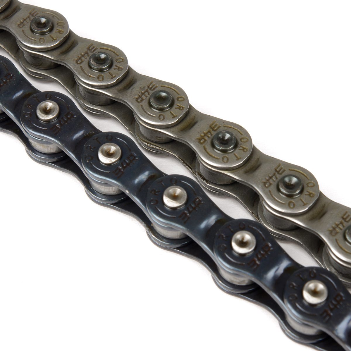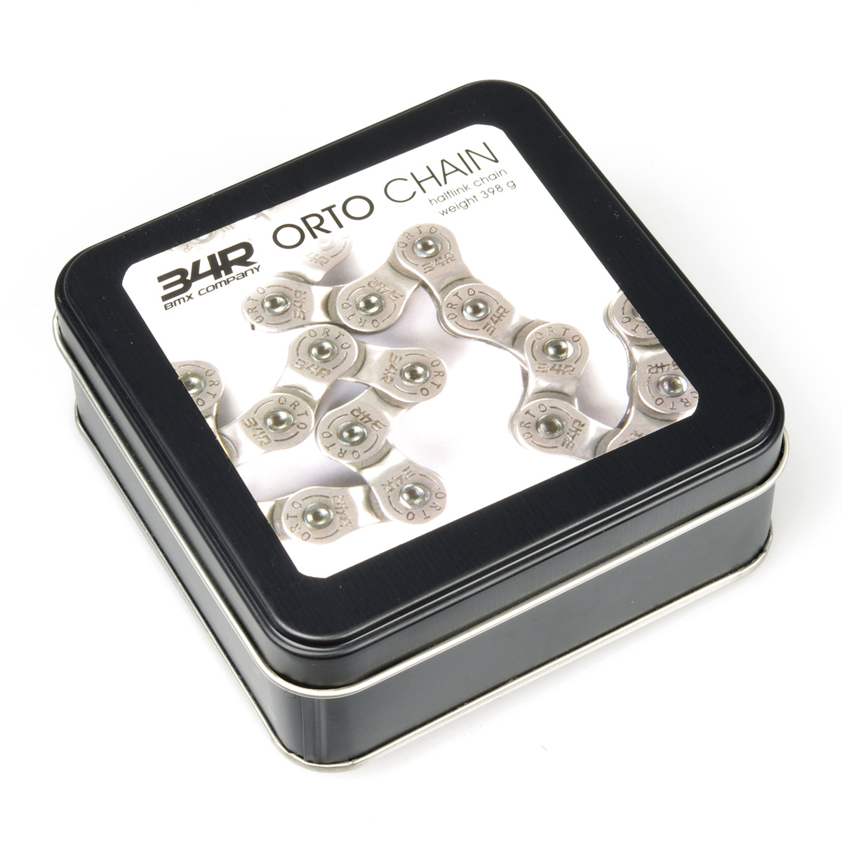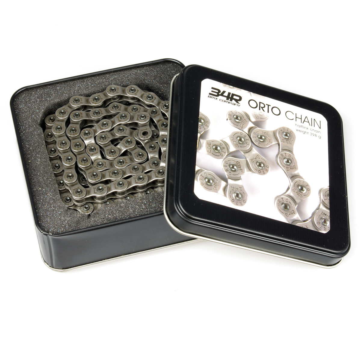 - half link řetěz- zesílené boční stěny- černý se stříbrnými piny- 110 článků- vyražené 34R logo- hmotnost 398 g