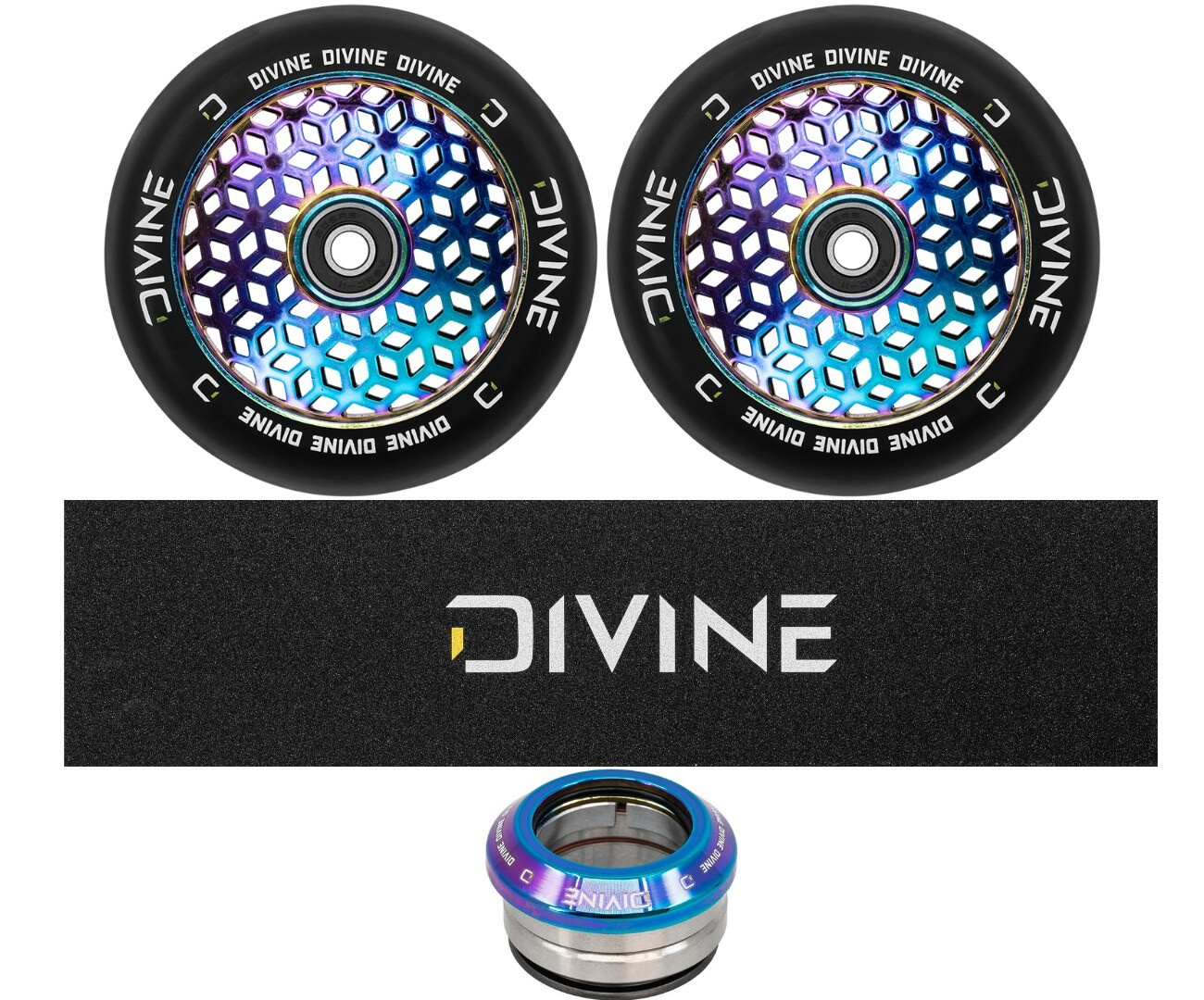 Set 2ks koleček Divine 110 mm Light Neochrome + Divine griptape + Divine headset