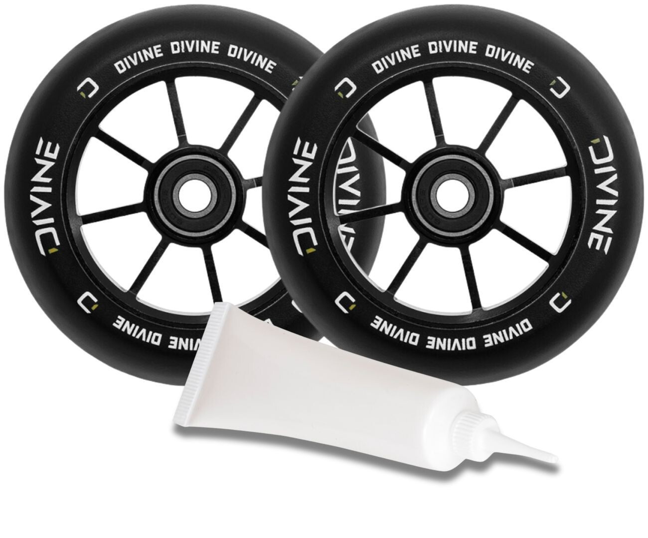 Výborné 110 mm kolečka s hliníkovým středem od nové české značky Divine. Šířka kolečka je standardní 24 mm. Ložiska ABEC 11 zaručují skvělou rychlost.