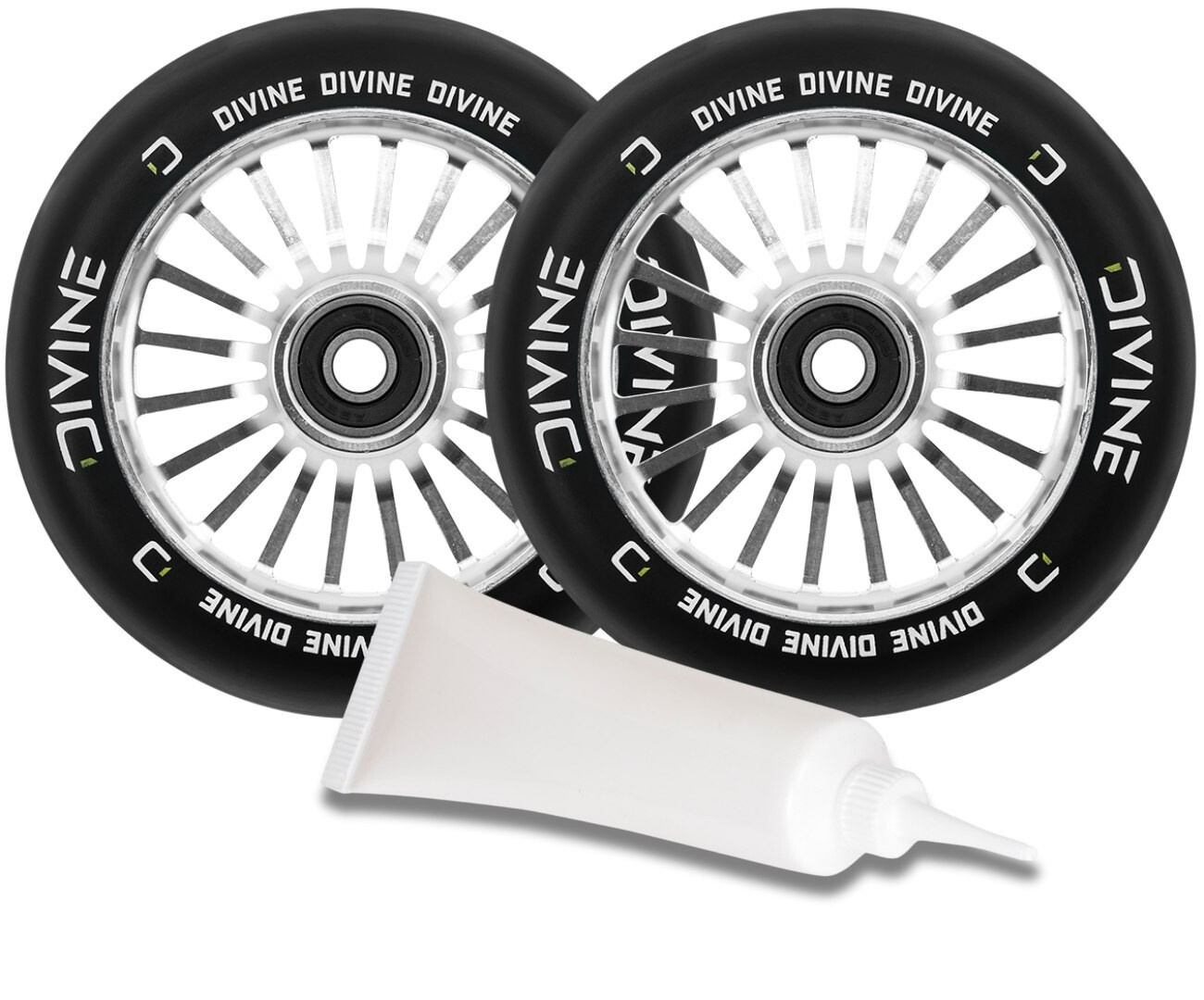 Výborné 110 mm kolečka s hliníkovým středem od nové české značky Divine. Šířka kolečka je standardní 24 mm. Ložiska ABEC 11 zaručují skvělou rychlost a přilnavost.