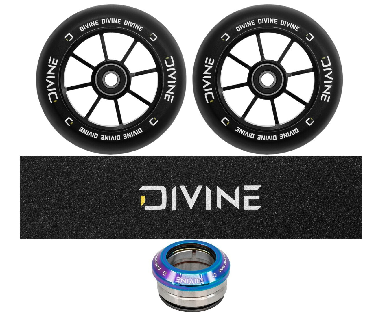 Výborné 120 mm kolečka s hliníkovým středem od nové české značky Divine. Šířka kolečka je standardní 24 mm. Ložiska ABEC 11 zaručují skvělou rychlost.