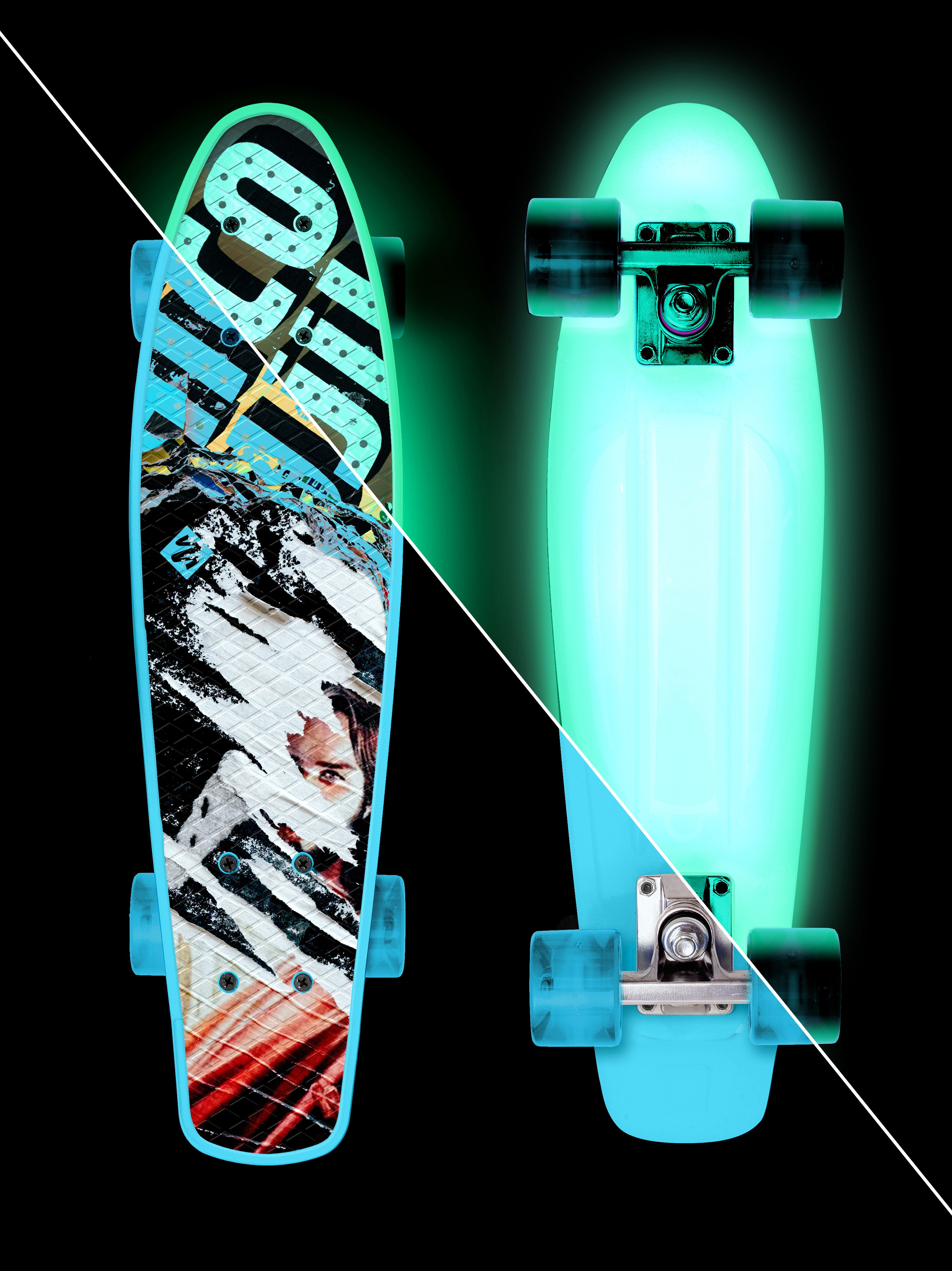 Vypadá jako běžný skateboard, ale jeho kouzlo se objeví po setmění! Speciální materiál desky se přes den nabíjí slunečním svitem a v noci září. Za jízdy se navíc rozsvítí kolečka, která jsou napájená dynamem.