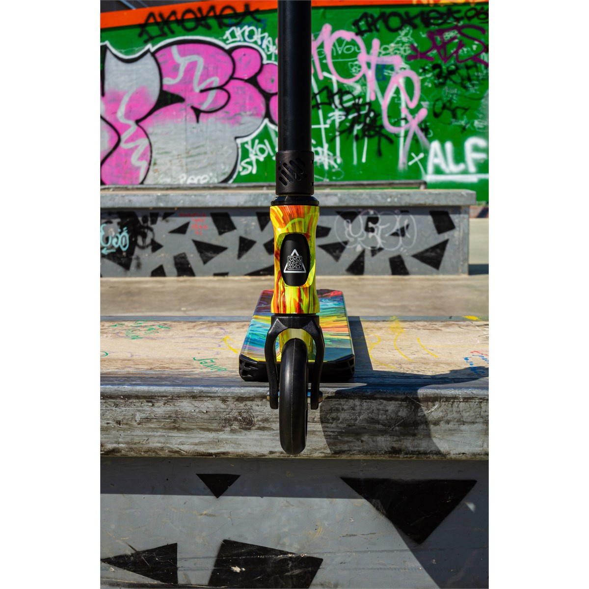 Výborná koloběžka pro mírně pokročilé jezdce. Koloběžka má nádherný žíhaný design. Samotná deska má 122mm šířku a 520mm délku což je nejlepší kombinace pro jezdce, co jezdí ve skateparku. Ke koloběžce dostanete dva druhy griptapu, jeden černý a jeden průhledný. Můžete si vybrat jaký použijete.
