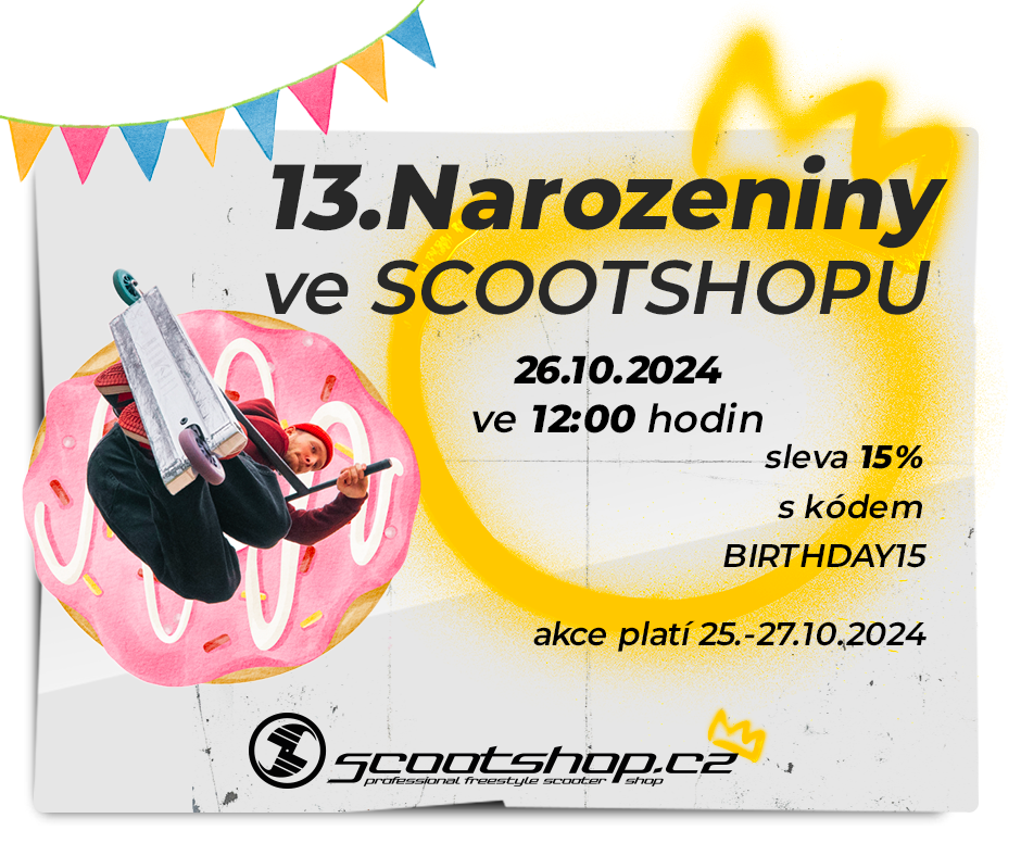 Scootshop.cz slaví 13 let a nesmí chybět oslava! Společně jezdíme už 13 let a jako poděkování za vaši přízeň jsme si pro vás připravili v období 25.10. - 27.10. 2024 super akci a to slevu 15% při zadání slevového kódu v košíku BIRTHDAY15 na veškeré zboží.