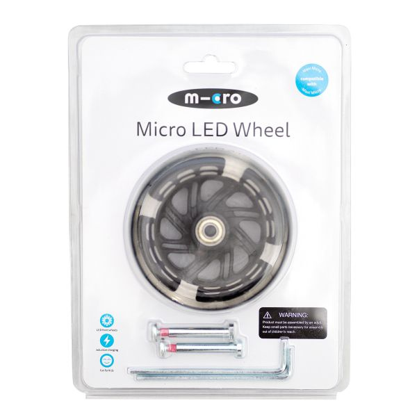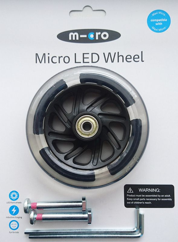Set 2 ks originálních LED koleček značky Micro včetně ložisek. Kolečka jsou určená pro koloběžky Maxi Micro. Součástí balení jsou 2 LED kolečka s ložisky, 2 šrouby a 2 inbusové klíče.