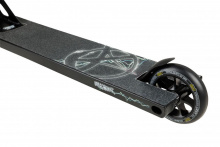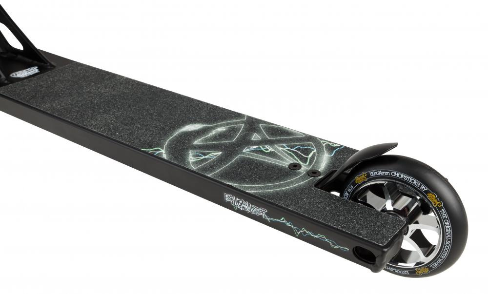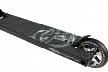 Na desce koloběžky jsou Eagle kolečka s šířkou gumy kolečka 24 mm a šířkou středu kolečka 24 mm s hliníkovým středem. Bezpružinková brzdička, která má zaoblený tvar, který přispívá k její odolnosti, šrouby jsou na imbus 4. Nechybí concave, griptape je se skvělým designem, jinak deská má klasický, hranatý, streetový tvar. Je zde i zahloubení pro matku, takže vám k dotažení kolečka bude stačit imbus 6. Spodek desky má také super design a svary jsou mimo tu desku, což je velké plus.