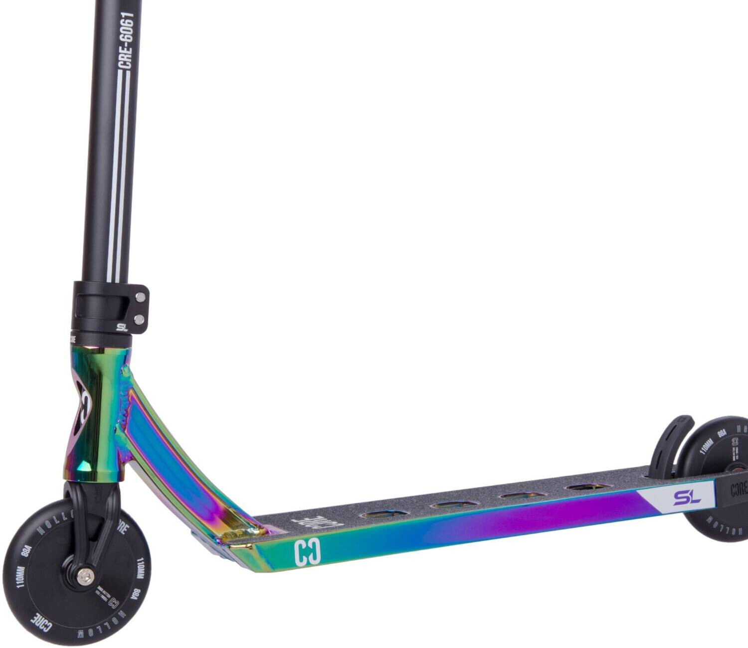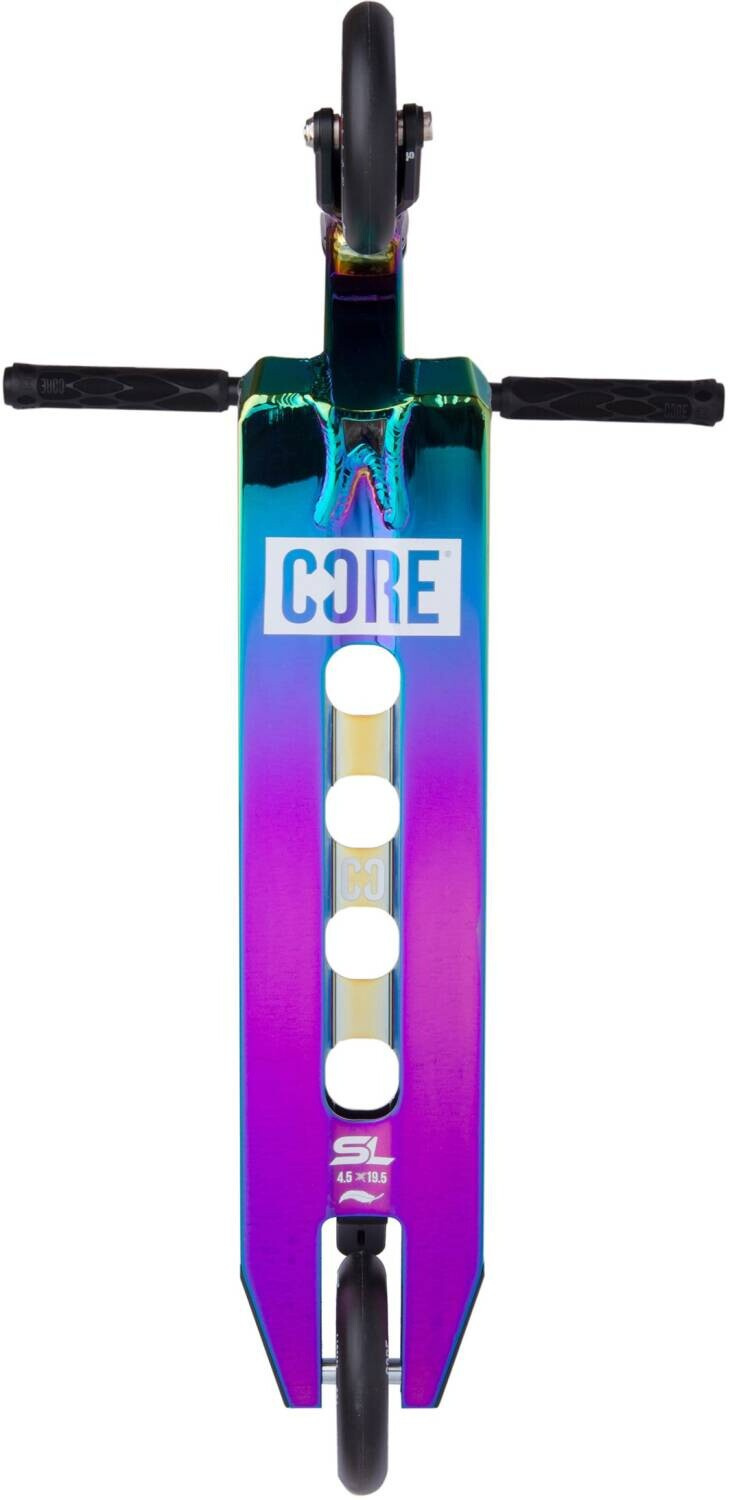Super koloběžka od značky CORE dělaná přímo do skateparku. Koloběžka váží pouhých 3200 gramů a to díky spoustě odlehčení, které jsou udělané na desce. Deska má rozměry 495 mm na délku, 114 mm na šířku a 345 mm na footspace. Na koloběžce jsou hliníková Y řidítka s rozměry 620 x 540 mm. Na koloběžce je zvolený IHC kompresní systém, který se bere jako nejlehčí. V jednodílné hliníkové vidlici nalezneme 110 mm kolečka s hliníkovým středem a ABEC 9 ložisky.