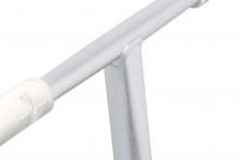 Řídítka mají bílé gripy, které jsou zabalené v další ochranné folii. Tyto gripy jsou klasické od značky Tilt, jsou suprově měkké, na koncovkách nechybí logo Tilt. Řídítka jsou ve tvaru "T", jsou hliníková a velice lehká. Řídítka nemají zářez, díky tomu vydrží déle. Výška řídítek je 597 mm a šířka řídítek je 508 mm.